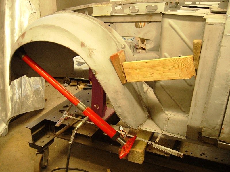Wieder auf der Richtbank sind nur kleinere Richtarbeiten an dem Karosseriegerippe nötig.